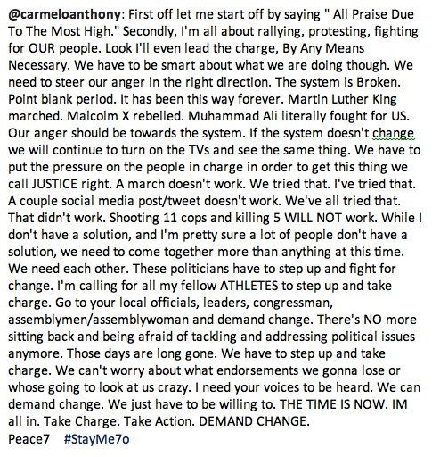 "I know tonight we are honoring Muhammad Ali, the 'G.O.A.T.', but to do his legacy any justice let's use this moment as a call to action for all professional athletes to educate ourselves, explore these issues, speak up, use our influence and renounce all violence,”